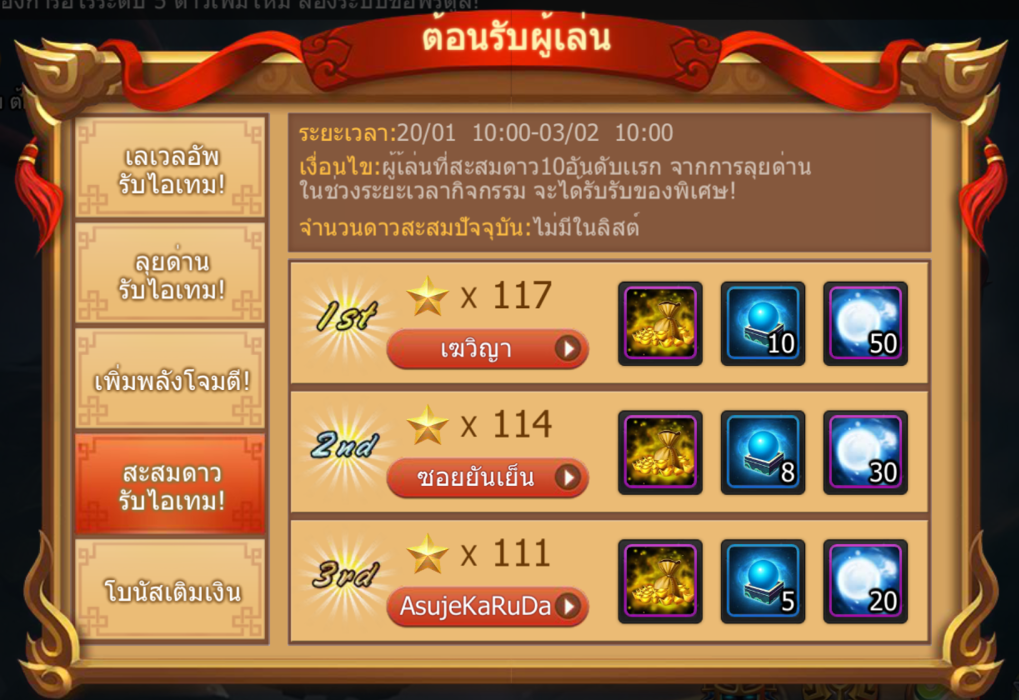 ผู้เล่นที่สะสมดาวได้ สูงสุด 10 อันดับเเรก จากการลุยด่านในช่วงระยะเวลากิจกรรม จะได้รับรับของพิเศษ!
