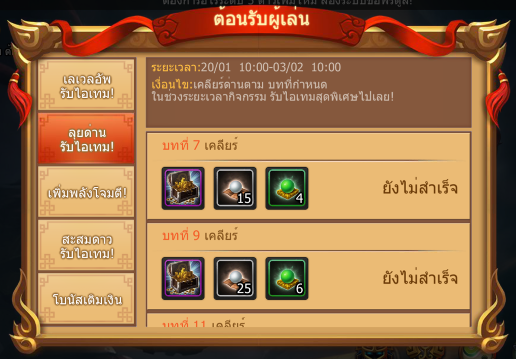 เงื่อนไขกิจกรรม : เล่นให้ผ่านด่านที่กำหนดเพื่อรับไอเทมโดยสามารถรับไอเทมได้ตั้งแต่บทที่ 7 เป็นต้นไป