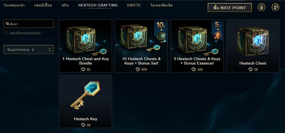 โดย Hextech Chest นั้นสามารถหาซื้อได้ในร้านค้าในราคา 38 RP (Chest + Key ในราคา 60 RP) หรือสามารถซื้อแบบ Bundle ในราคา 600 RP (ภายในมี Chest + Key อย่างละ 11 ชิ้น) อีกทั้งยังสามารถรับ Hextech Chest ได้เมื่อคุณสามารถทำเกรด S ในแชมเปี้ยนแต่ละตัวได้ สำหรับใครที่ยังไม่ทราบว่าจะได้อะไรบ้าง มีโอกาสเท่าไร เรามาอ่านข้อมูลกันเลยดีกว่าครับ
