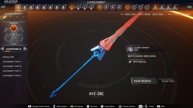 ● Close Combat : อาวุธระยะประชิด ปรับแต่งหลากหลายชนิด ท่วงท่าการโจมตีก็ปรับไปตามการใช้งานของมัน