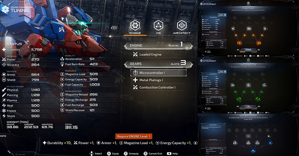 Engine - เน้นไปทางด้านสถานะ Durability และ Armor เป็นหลัก ส่งผลให้หุ่นยนต์ของเรามีค่า HP และค่า Defense เพิ่มขึ้น