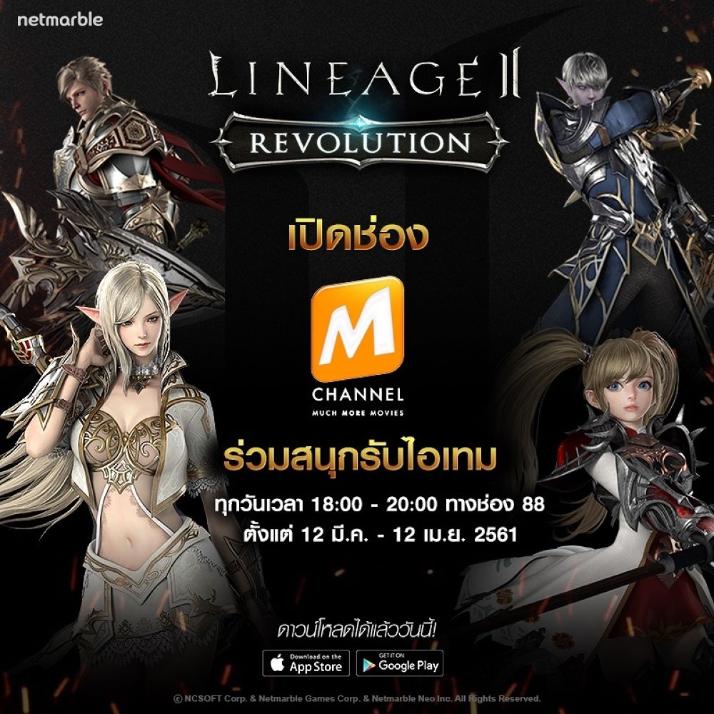 สำหรับคอหนังชาว Lineage ll Revolution ตั้งแต่วันที่ 12 มี.ค. ถึง 12 เม.ย. นี้ รีบจับจ้องหน้าจอ M Channel ช่อง 88 ทุกวัน เวลา 18:00 – 20:00 กันให้ดี เพราะเขามีกิจกรรมแจกโค้ดไอเทมเกม Lineage ll Revolution แถมยังร่วมสนุกกันได้ทุกวัน ไอเทมไม่มีซ้ำตลอด 1 เดือน!