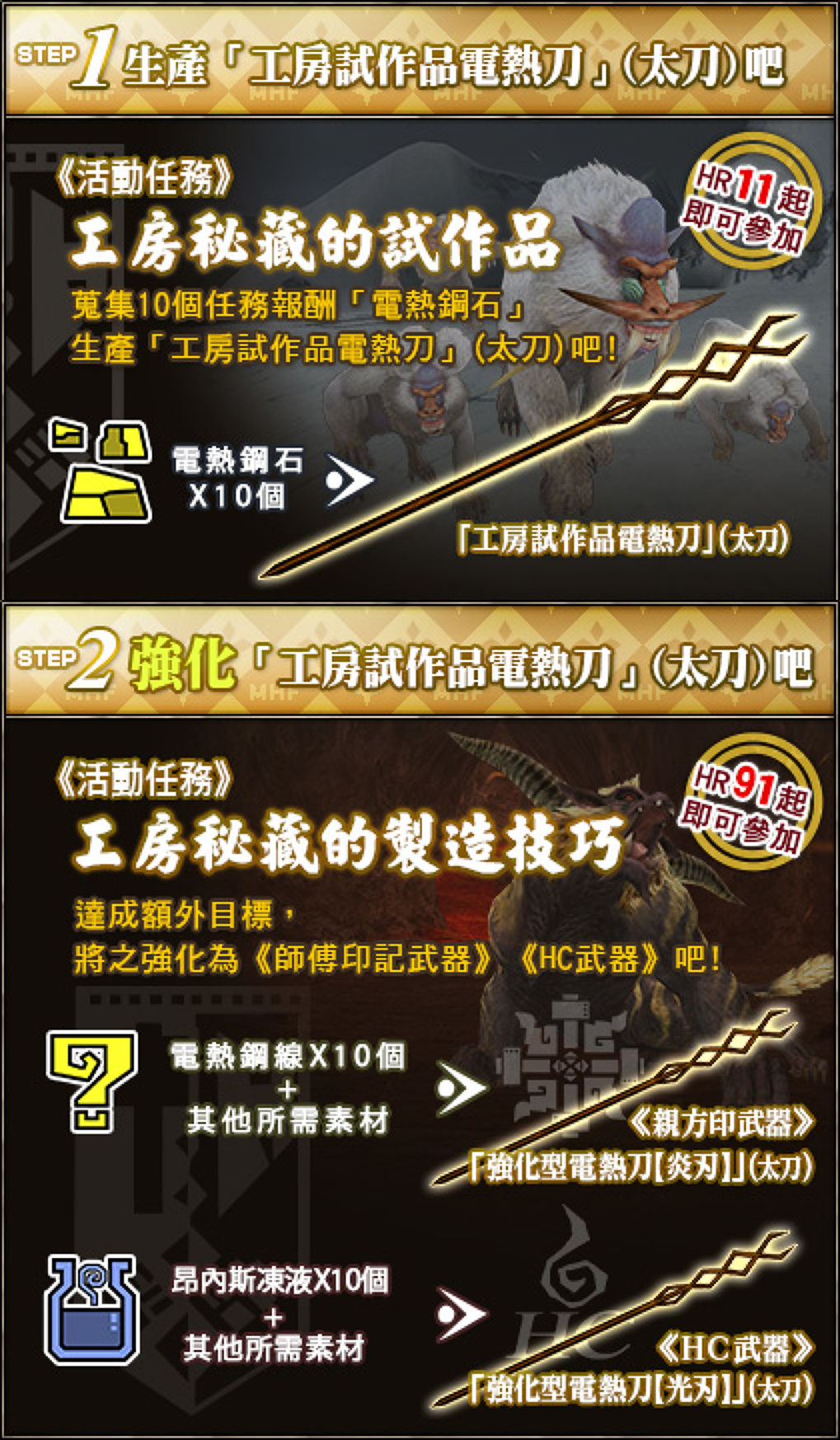 - เควสที่ 3 「工房秘藏的製造技巧」 HR/SR91 เงื่อนไขคือกำจัดราจัง เมื่อจบเควสจะได้ไอเทมมาอัพเกรดอาวุธ