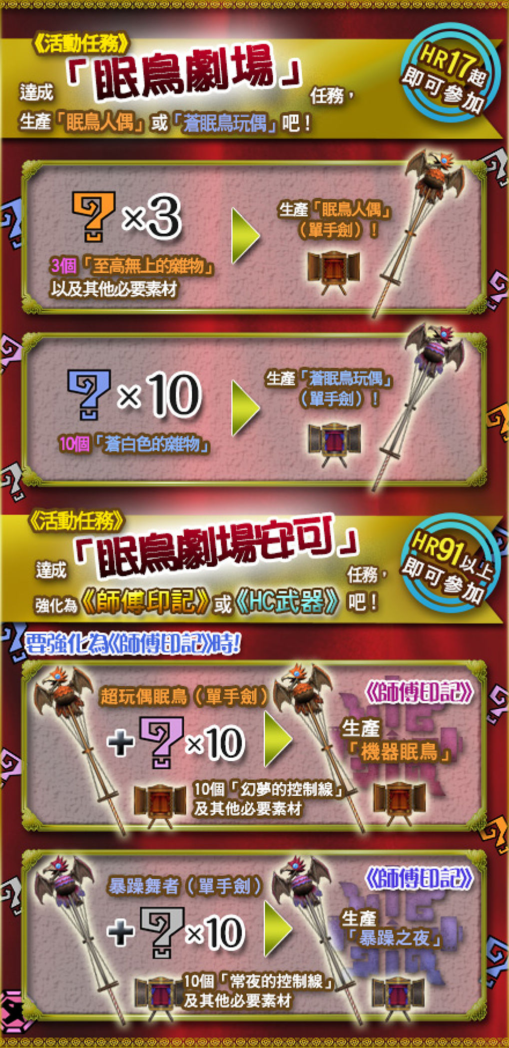 - เควสที่ 2 「眠鳥劇場安可」 HR/SR91 เราจะต้องกำจัดฮิบน็อคสีม่วงในเควส เมื่อจบเควสจะได้ไอเทมมาอัพเกรดดาบโล่