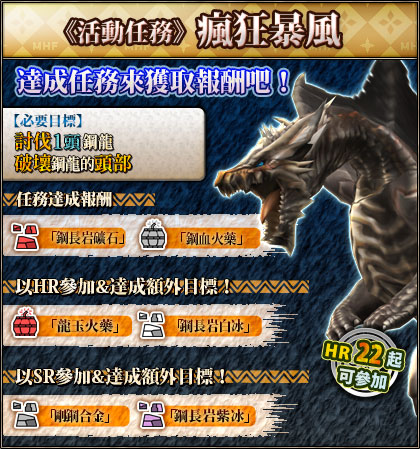 - เควส「瘋狂暴風」 HR/SR22 เงื่อนไขคือทำลายเขามังกรคูชาลดาโอร่า และกำจัดมัน เมื่อจบเควสจะได้ไอเทมมาสร้างอาวุธ