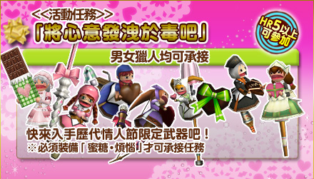 -- ผู้หญิงต้องเล่นเควส 1 เพื่อหาของสร้างอาวุธ และจะได้ 波爾多巧克力 สำหรับส่งให้เพื่อนผู้ชายทางจดหมาย