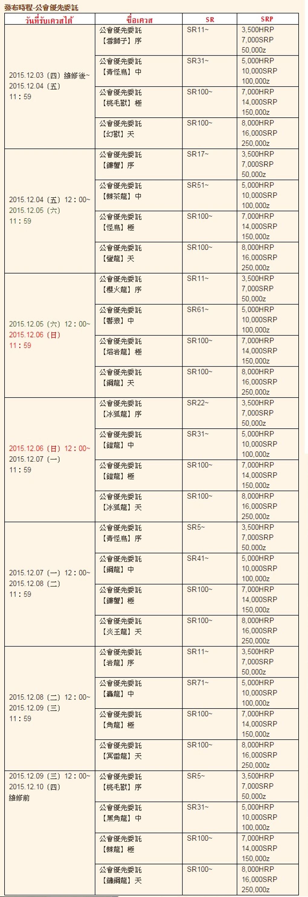 Event เควสแจกเลเวลและเงินประจำเดือนธันวาคม โดยเควสส่วนใหญ่เป็นเควสของระดับ SR และ GR ซึ่งแต่ละเควสนั้นจะให้ค่าประสบการณ์และเงินเยอะมากๆเลยทีเดียว ใครที่กำลังเก็บเลเวลอยู่ห้ามพลาดเด็ดขาดเลย เพราะมีโอกาสไม่บ่อยนักที่จะได้เล่นเควสดีๆแบบนี้ นอกจากนี้สามารถเติมคอสพรีเมี่ยมเพื่อเพิ่มเงินและค่าประสบการณ์ที่รับได้อีกด้วย