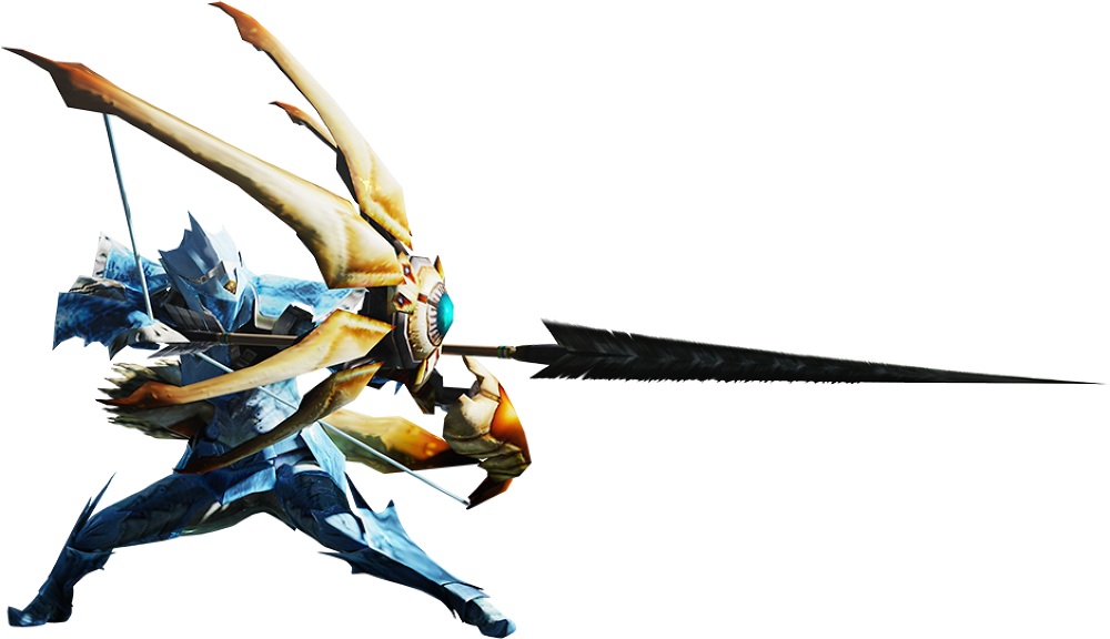 ธนู อาวุธยิงใช้ลูกธนู ยิงต่อเนื่องสร้างความเสียหายได้สูง เสริมพลังด้วยน้ำยาต่างๆ ลูกธนูมีไม่จำกัด ชาร์จยิงเพิ่มพลังโจมตีได้ด้วย การชาร์จยิงมีถึง 4 ระดับซึ่งจะเพิ่มทั้งพลังโจมตีและความแรงของธาตุ  ประเภทของลูกธนูก็มีให้เลือก 4 แบบก็คือ ยิงรัว ยิงกระจาย ยิงเจาะเกราะ และเพิ่มระยะยิงไกล ระยะยิงของธนูส่งผลต่อพลังโจมตีโดยตรง หากไกลเกินไปก็จะทำความเสียหายได้น้อย