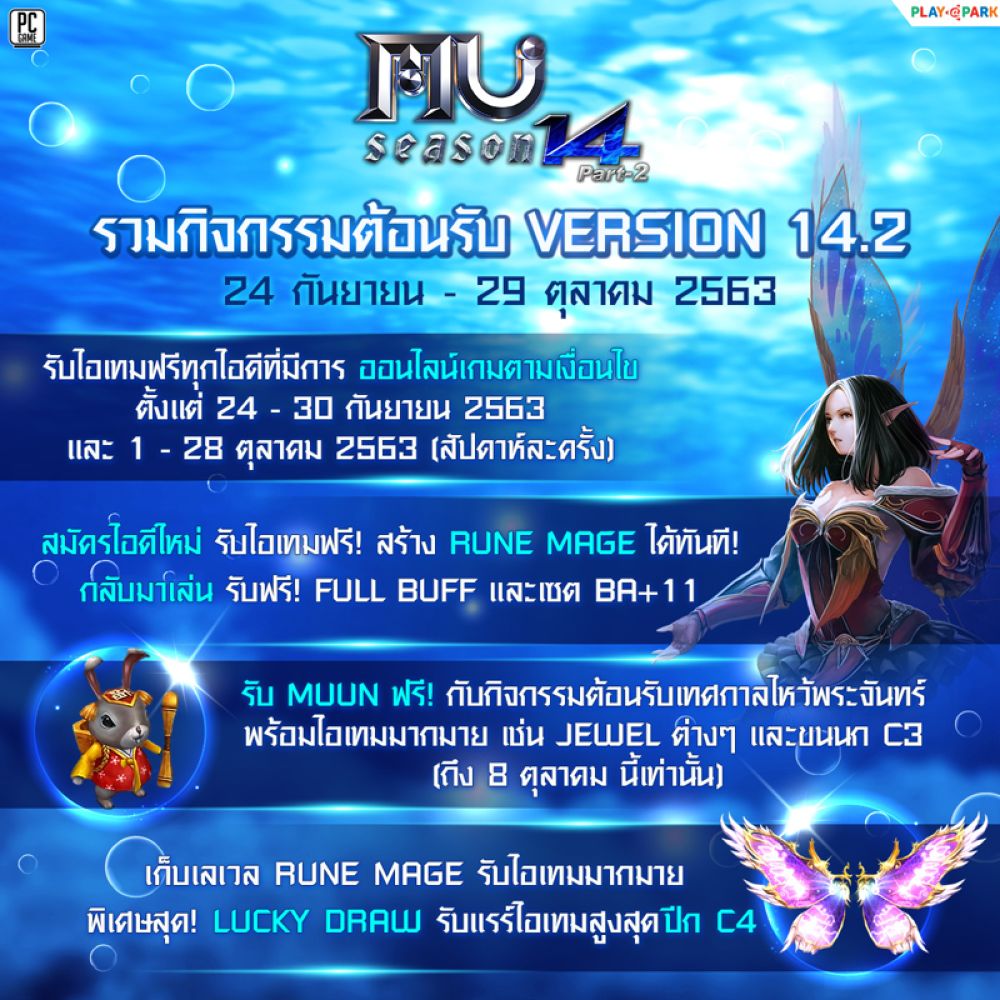 ไปด้วย รวมไปถึงกิจกรรมและโปรโมชั่นต้อนรับอัปเดตใหม่ ที่มีของรางวัลและความสนุกให้กับเหล่านักรบไปไปสนุกเพียบ ซึ่งมีตั้งแต่วันที่ 24 กันยายน ถึง 29 ตุลาคม 2563 ติดตามรายละเอียดเพิ่มเติมได้ที่เว็บไซต์กิจกรรมของ MU Online