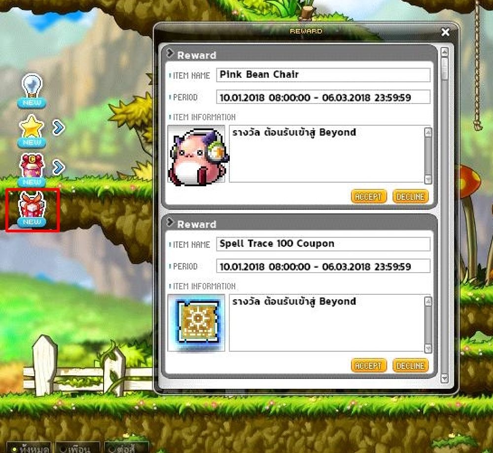 - รับเซตของรางวัลสุดคิ้วท์แบบเน้นๆ แค่เข้าเกมแล้วกดรูปกล่องของขวัญทางซ้ายของจอไม่ว่าจะเป็นเก้าอี้ Pink Bean chair สุดน่ารัก 30 วัน, Spelltrace 100 coupon จำนวน 3 ชุด และพาหนะ Mystical Butterflies Mount 30วัน ดูรายละเอียดเพิ่มเติมได้ที่http://bit.ly/2B2wsIq
