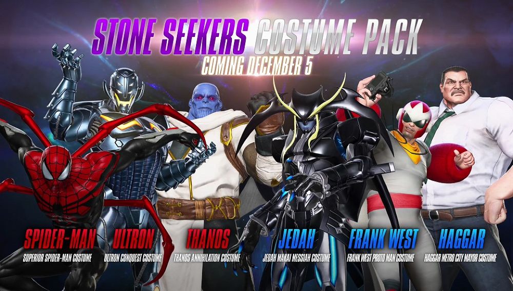 "Stone Seekers Costume Pack" เป็นชุดคอสตูมที่จะอัพเดทให้กับตัวละคร Ultron, Thanos, Spider-Man, Frank West, Haggar และ Jedah โดยราคาเนื้อหาเสริม [DLC] สนนราคาอยู่ที่ราวๆ $3.99 หรือตีเป็นเงินไทย 140 บาทต่อชุด ซึ่งจะวางจำหน่ายอย่างเป็นทางการในวันที่ 5 ธันวาคมที่จะถึงนี้ทุกแพลทฟอร์มทั้ง PC, PlayStation 4 และ Xbox One