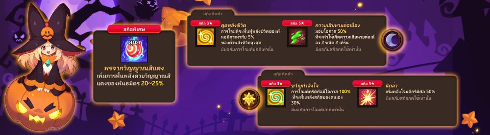 ส่วนสกิลของเจ้าแจ็ค-โอ-ลินน์ ก็ไม่ธรรมดา เพราะมีทีเด็ดอยู่ที่การฟื้นพลัง ในธาตุมืดสามารถฟื้นพลังให้ทีมได้เมื่อโจมตี ส่วนธาตุแสงก็สามารถฟื้นพลังสกิลของตนเอง 30% เมื่อโจมตีติดคริติคัล มีติดทีมไว้ อุ่นใจแน่นอน