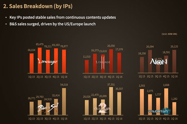 ในไตรมาสที่ 1 ปี 2016 ผลการดำเนินของทาง NCSoft แสดงให้เห็นว่าแข็งแกร่งขึ้นจากเกม Blade & Soul ที่ได้นำไปเปิดในเซิร์ฟเวอร์ตะวันตก นอกจากนี้ยังแสดงให้เห็นถึงปัญหาใหญ่ของเกม WildStar เพราะเกมยังไม่สามารถทำกำไรให้กับทางบริษัทได้เลย นับว่าเป็นปีทองของทาง NCSoft จริง ๆ ค่ะ เพราะหลังจากเปิดตัว Blade & Soul บนเซิร์ฟเวอร์ตะวันตก ยอดกำไรของทางบริษัทก็พุ่งลิ้วเลย ก็เกมมันสนุกสมคำร่ำรือนิคะ สำหรับเกม MOBA น้องใหม่อย่าง Master X Master และเกม MMORPG อย่าง Lineage Eternal ตอนนี้ก็กระแสแรงมากเช่นกัน เพราะเกมเมอร์หลายท่านก็กำลังจดจ่อรอวัน Open Beta ของสองเกมนี้ ซึ่งน่าจะเปิดให้เล่นช่วงปลายปีนี้ ตัวดิฉันก็รออยู่เหมือนกันค่ะ