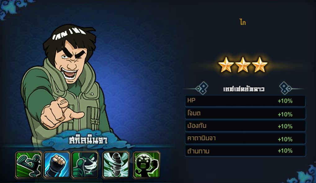 นินจาทุกๆตัวในตอนนี้จะสามารถอัพเกรดความสามารถสูงสุดได้ 5 ดาว ในแต่ละดาวนั้นเมื่ออัพเกรดแล้วจะเพิ่มความสามารถเป็นเปอร์เซ็นต์ แต่อัตราของค่าสถานะที่เพิ่มมาแต่ละตัวนั้นไม่เท่ากันตามนี้
