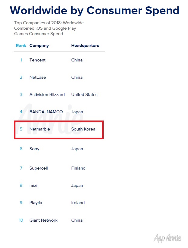 จากรายงานล่าสุดของ App Annie บริษัทวิจัยทางด้านมือถือ ได้เผยออกมาว่า Netmarble เป็น 1 ในสุดยอด 5 บริษัทใหญ่ที่มียอดใช้จ่ายรวมของผู้บริโภคจากทั่วโลกทั้งระบบ iOS และ Google Play ในปี 2018 โดยเน็ตมาร์เบิ้ลอยู่ในกลุ่มเดียวกับ Tencent, NetEase, Activision Blizzard, และ BANDAI NAMCO ซึ่งทั้งหมดเป็นบริษัทเกม