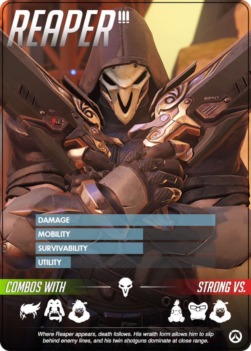 Reaper เป็นฮีโร่ที่มีความสามารถในการลอบโจมตีและจู่โจมในระยะใกล้ได้ดีมาก โดยเฉพาะท่าไม้ตายของเขาสามารถกวาดศัตรูให้ลงไปกองได้อย่างรวดเร็ว นอกจากนี้เค้ายังฟื้นฟูเลือดของตัวเองได้ด้วยการเก็บดวงวิญญาณเมื่อมีทีมตรงข้ามตาย ทำให้การหยุดเค้านั้นเป็นเรื่องยากมากหากเค้าได้ทะลวงแผงหลังเข้ามาแล้ว ในการเล่น Reaper ให้มีประสิทธิภาพคุณจะต้องจดจำแผนที่นั้นๆ และจุดที่สามารถวาร์บได้ให้ดี เพื่อที่จะลัดเลาะไปเก็บแผงหลังของอีกทีม โดยเฉพาะการหาจุดเข้าไปเซอร์ไพรต์สไนเปอร์ของศัตรูรับรองเลยว่ายิงไม่กี่นัดอีกฝ่ายลงไปกองแน่นอน สิ่งที่สำคัญและเราไม่ควรลืมคือ Reaper จะต่อสู้ได้ดีที่สุดในระยะใกล้ ดังนั้นพยามหลีกหลี่ยงที่จะต่อสู้ในระยะอื่นหากไม่จำเป็น และให้ระวังอีกฝ่ายเห็นแล้วหันมารุมให้ดีๆ เพราะถึงแม้ว่าเลือดค่อนข้างเยอะในกลุ่ม Offense ด้วยกันแต่โดยรุมก็ตายเอาได้ง่ายๆอยู่ดี และอย่าลืมใช้ Wraith Form ที่ทำให้เป็นอมตะชั่วคราวหากโดนรุมหรือคิดว่าสู้ไม่ไหวแน่ๆ ให้่ใช้หนีไปทางเพื่อน, จุดลับตา หรือไปเก็บเลือดตามด่านเพื่อตั้งหลัก เมื่อเราใช้สกิล Wraith Form หรือ Shadow Step จะมีระยะเวลาแสดงผลเล็กน้อยก่อนจะทำการเข้าต่อสู้ได้ ทำให้ในระหว่างนี้เราอาจจะเป็นเป้านิ่้งของอีกฝ่ายเอาได้ง่ายๆ ดังนั้นเราไม่ควรไปปรากฏตัวในดงศัตรูด้วยสกิลเหล่านี้แบบตรงๆ แต่ควรจะไปโผล่ในจุดอับสายตาของศัตรูแทนแล้วค่อยโผล่ออกไปเซอร์ไพรต์จะดีกว่าครับ ( ให้แท้งเปิดเข้าไปป่วน แล้ว ฮายย เปิดอัลติก็ได้ !! )