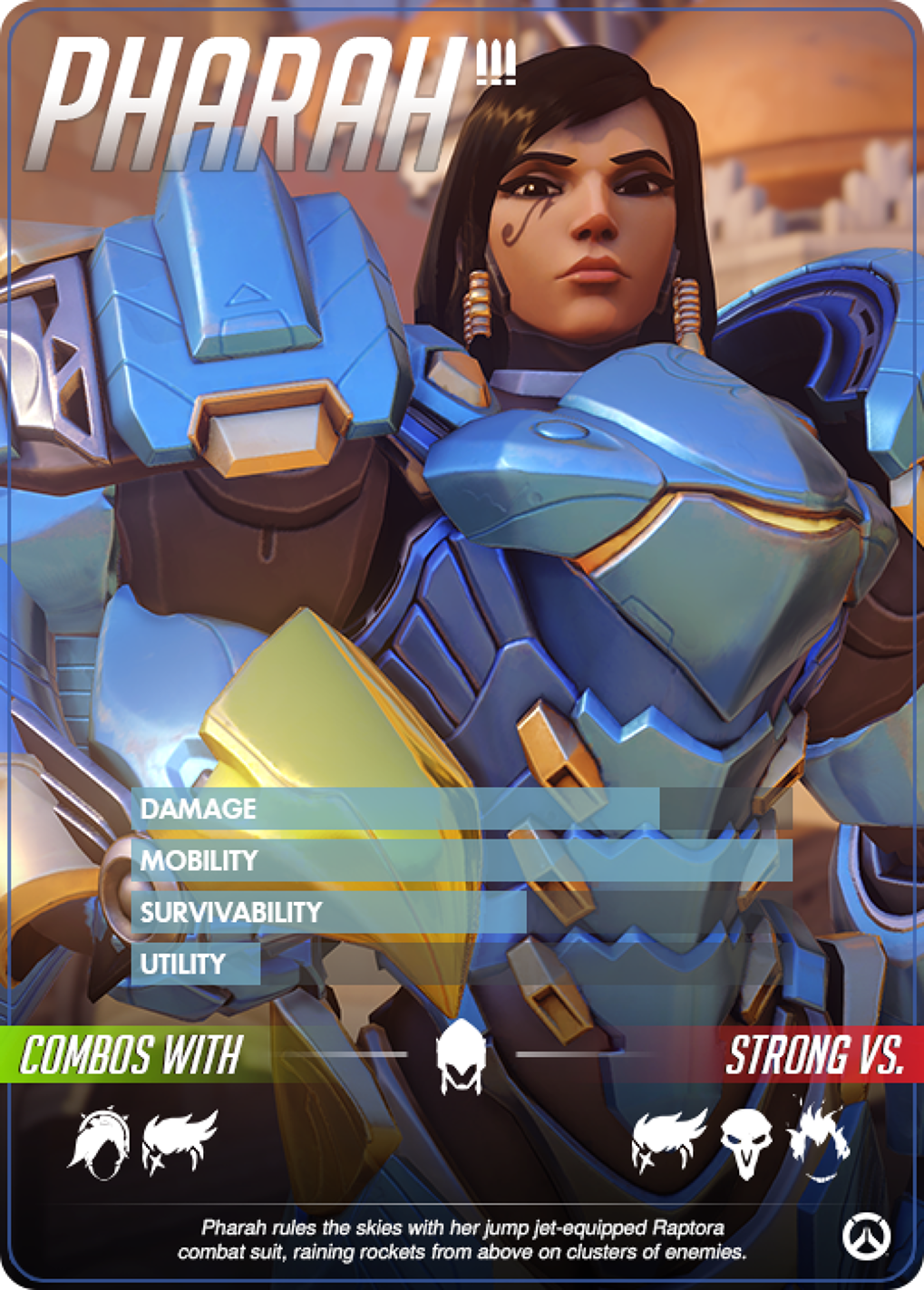 ท่าไม้ตายของ Pharah นั้นมีประสิทธิภาพและพลังทำลายล้างสูงมาก แต่ก็ต้องแลกกับการที่เธอจะต้องอยู่เฉยๆในระยะเวลาหนึ่ง ดังนั้นทางที่ดีเราควรเก็บเอาไว้ใช้หลังจากที่เพื่อนเข้าไปเปิดให้เราแล้ว จากนั้นจึงค่อยใช้ Barrage ถล่มศัตรูตามเข้าไป และจะดีมากๆหากใช้ร่วมกับสกิลอันติเมทของตัวอื่นๆอย่างเช่น Graviton Surge ของ Zarya, Earthshatter ของ Reinhardt หรือ Blizzard ของ Mei การต่อสู้กับ Pharah นั้นเราสามารถใช้ตัวละครที่โจมตีได้ดีในระยะไกลอย่าง Widowmaker ให้คอยโฟกัสไปที่เธอ จะทำให้เธอไม่กล้าบินบ่อยเท่าที่ควร หรือการสร้างป้อมในมุมอับของ Torbjörn 24 เองก็จะทำให้เธอบินขึ้นมายิงได้ลำบาก หรือหากว่าง่ายกว่านั้นก็คือการใช้ตัวละครเบสิคอย่าง Soldier: 76 มายิงกับเธอตรงๆเลย เพราะในช่วงที่เธอบินนั้น 76 ที่เล่นเป็นสามารถจะเล็งและยิงจัดการเธอได้ไม่ยากนัก
