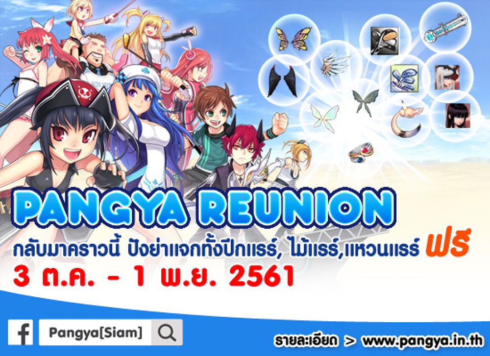 ความสนุกขบวนแรก ยิ่งเก่า ยิ่งเก๋า ยิ่งได้ของมาก► จัดเต็มกับแคมเปญสุดยิ่งใหญ่อลังการ PANGYA REUNION ที่จะชวนเพื่อน ๆ ไปตีปังและเก็บแต้มรางวัลให้หนำใจเพื่อแลกเป็นแรร์ไอเทม เช่น ปีก Phoenix ปีกที่ทำให้บินได้เมื่อใครเห็นก็ต้องอิจฉา, ไม้กอล์ฟ มีคุณสมบัติพิเศษที่ช่วยเพิ่มสเตตัสความสามารถให้เก่งขึ้น, แหวน เมื่อใส่แล้วจะทำให้ตีติดปังง่ายขึ้น และอื่น ๆ ใครที่คิดถึงบรรยากาศอบอุ่นที่คุ้นเคย มิตรภาพที่น่ารัก ทีมงานที่เป็นกันเอง ต้องไม่พลาดกิจกรรมนี้เด็ดขาด ผู้เล่นที่มีไอดีเก่าสามารถล็อกอินเข้าเกมปังย่าแล้วไปออกรอบกันได้เลย และสำหรับเพื่อน ๆ มือใหม่ไม่ต้องกังวลใจไป เมื่อสมัครไอดีใหม่ก็ยังมีสิทธิ์รับไอเทมได้เช่นกัน ความสนุกครื้นเครงแบบนี้มีแค่ช่วงปิดเทอมนี้เท่านั้น เริ่มตั้งแต่วันนี้ ถึง 1 พ.ย. 61