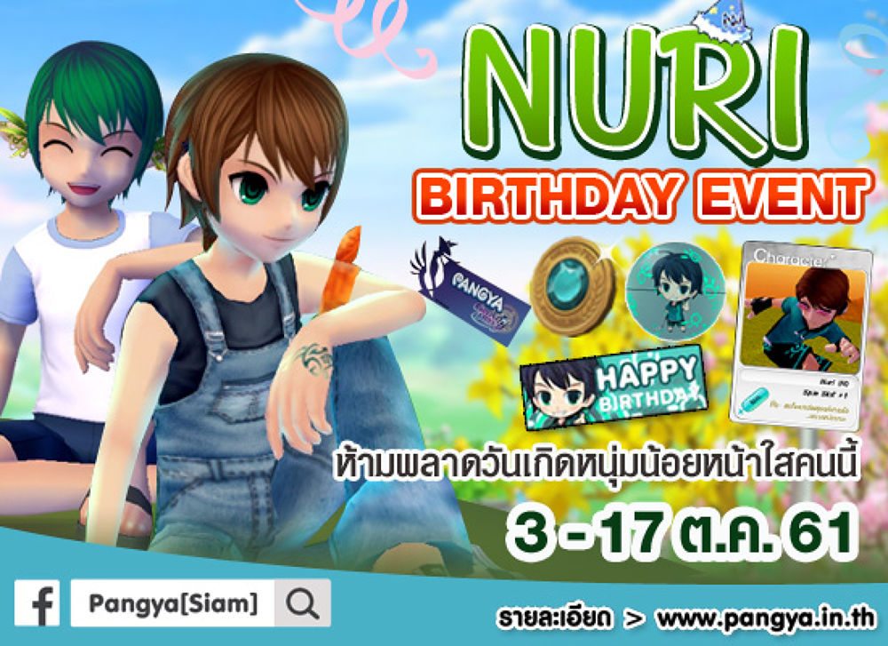 ความสนุกขบวนที่สอง แฮปปี้เบิร์ดเดย์ ทู Nuri► ปาร์ตี้วันเกิดของหนุ่มน้อยหน้าใสแห่งเกาะปังย่า Nuri Birthday Event มีแจกไอเทมแบบลิมิเต็ดให้ชาวเกมเมอร์ได้ร่วมสนุกกันถึง 3 ต่อ เริ่มตั้งแต่วันนี้ ถึง 17 ต.ค. 61