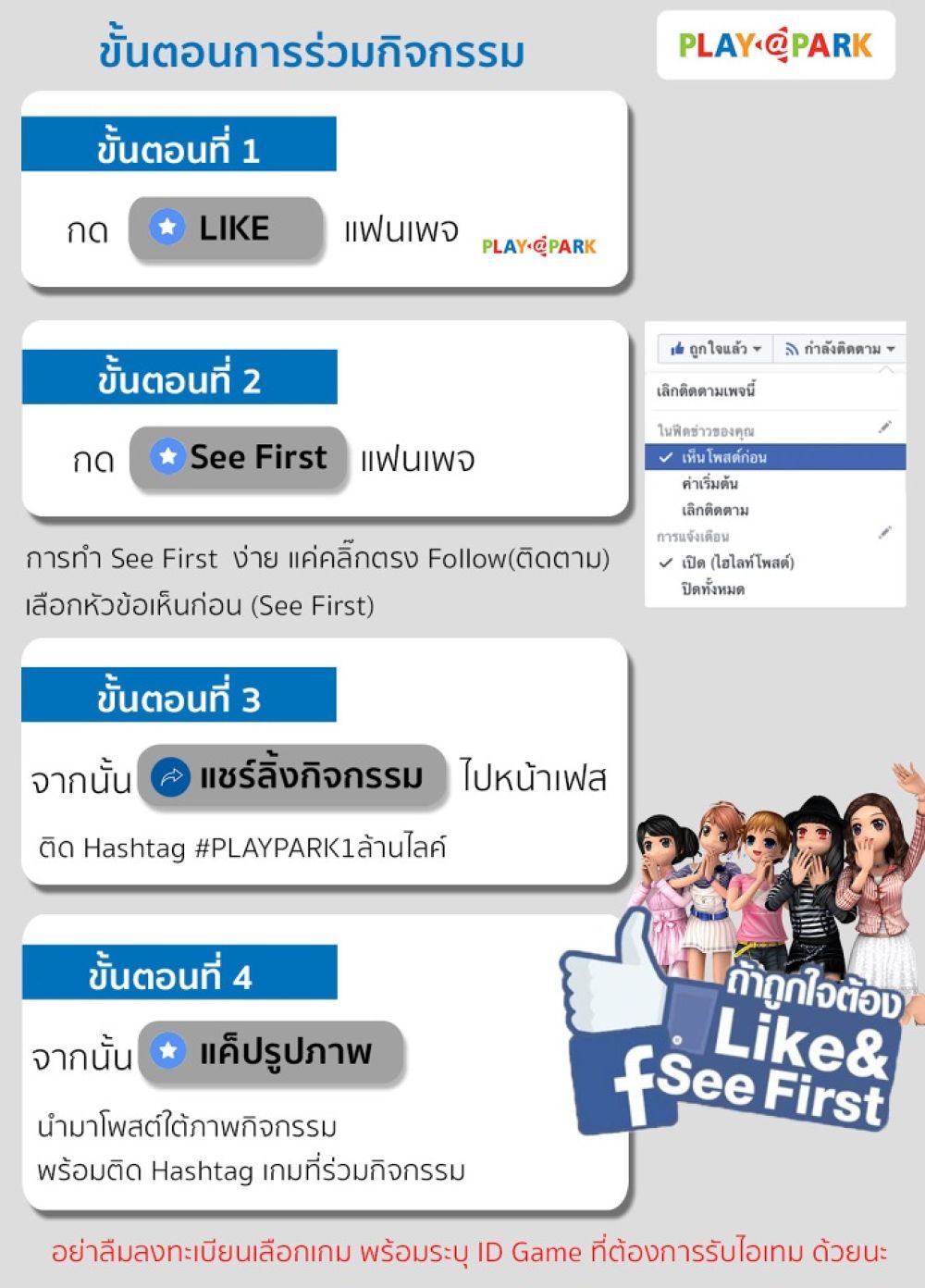 PLAYPARK.COM ผู้ให้บริการเกมออนไลน์ชั้นนำ ในเครือเอเชียซอฟท์ฯ ฉลอง Facebook Fan Page PLAYPARK ทะลุ 1,000,000 Like เพื่อเป็นการขอบคุณเพื่อนๆ เกมเมอร์ที่ให้การสนับสนุน และติดตามข่าวสารจากแฟนเพจด้วยดีตลอดมา PLAYPARK จึงจัดกิจกรรมแจกไอเทมสุดแรร์รวม 300 รางวัล จาก 6 เกมดัง ได้แก่ Audition, Dragon Nest, Yulgang, Granado Espada, RAN Online, Luna X Online ร่วมสนุกได้ตั้งแต่ วันนี้ – 6 มีนาคมนี้เท่านั้น