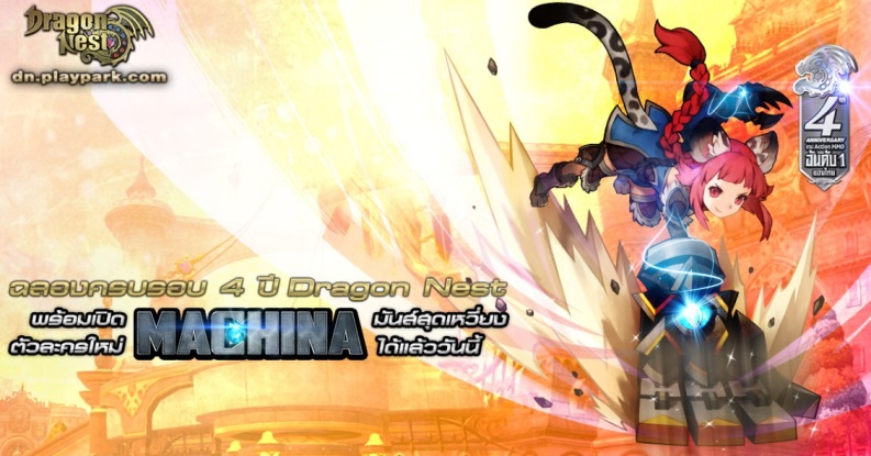 ฉลองครบรอบ 4 ปี สุดยิ่งใหญ่ตลอดเดือนนี้ แจกหนักจัดเต็มไอเทมมูลค่ากว่า100 ล้านบาท และกิจกรรมมากมายไม่ว่าจะเป็นบัฟสุดโหดสูงสุด EXP คูณ 600% ไอเทมต้อนรับนักรบหน้าใหม่และนักรบรุ่นเก๋ารีเทิร์น มูลค่าถึง 700 และ 2,000 บาทพร้อมด้วยการอัพเดตตัวละครใหม่ “Machina” แมวสาวแสนซน แขนกลสุดโหด ที่จะมาเขย่าหัวใจทุกคนแล้วตั้งแต่วันนี้ ข้อมูลเพิ่มเติมhttp://news.playpark.com/th/32615 หรือ กลุ่ม FB Dragon Nest Thailand Community