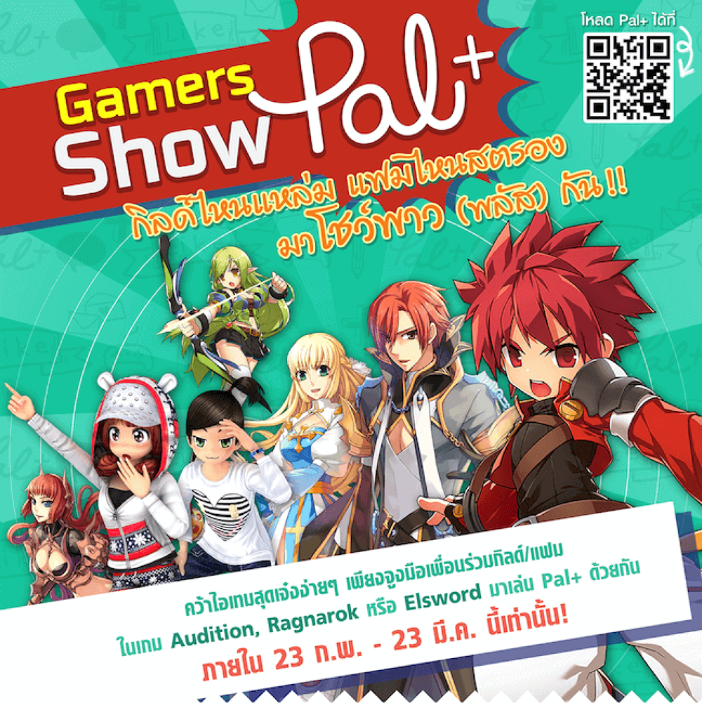 ขอท้าเกมเมอร์เกมดังไม่ว่าจะเป็นRagnarok, Elsword และAudition มาโชว์พลังกับกิจกรรม “Gamer Show Pal+” รวบรวมเพื่อนร่วมกิลด์ร่วมแฟมมาเข้าบอร์ดให้ได้มากที่สุด รับไปเลยไอเทมเลิศๆ ฟรี!!! ถึง 23 มี.ค.นี้ แอพสามารถดาวน์โหลดได้แล้ววันนี้ทั้งระบบ Android และ iOS