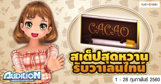 Audition เกมแดนซ์ออนไลน์สุดฮิต อันดับ 1 ของเมืองไทย พบกิจกรรมสำหรับขาแดนซ์ในเดือนแห่งความรักนี้กับ ภารกิจเต้นเก็บรอบเพลงใดก็ได้ครบ 100 รอบ รับไอเทม Valentine's Day CACAO Chocolate ไปเลย พิเศษ!สำหรับคนมีคู่ในเกม ทีมงานจัดไอเทม Pink heart wing แถมเพิ่มให้อีก แน่นอนว่าถ้าเต้นคนเดียวเหงาๆ ในห้องจะไม่ถูกนับรอบนะจ๊ะ!!