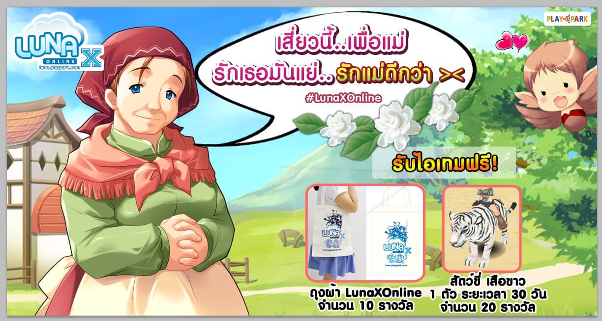 Luna X Online ตำนานแห่งเกมสุดแบ๊ว ชวนเพื่อนๆ สายแบ๊วทุกคนมาร่วมกิจกรรม เสี่ยวนี้... เพื่อ "แม่" แค่เพื่อนๆ กด Like แฟนเพจPlaypark Luna X Online และเข้าไป Share โพสกิจกรรมนี้ โดยเปิดเป็นสาธารณะและพิมพ์ "มุขเสี่ยวบอกรักแม่" ลงบนโพสที่แชร์ จากนั้น แคปภาพที่แชร์มาแปะใต้โพสกิจกรรม มุขไหนเสี่ยวยอดเยี่ยมลุ้นรับของรางวัลไปได้เลย!!กิจกรรมเริ่มแล้วตั้งแต่วันนี้ – 14 สิงหาคม 2560รายละเอียดเพิ่มเติม (คลิกที่นี่)