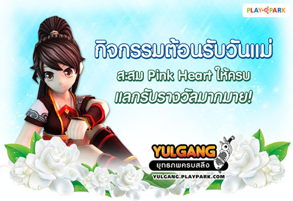 Yulgang ยุทธภพครบสลึง สุดยอดเกม MMOแนวจีนในประเทศไทย ชวนเพื่อนๆ มาสะสมPink Heart ให้ครบทั้ง 3 ชิ้น ตามเควสที่ได้รับ (เควส ความรักของแม่) แล้วนำมาแลกรับของรางวัลไปได้เลย!! เข้าร่วมกิจกรรมได้แล้วตั้งแต่วันนี้- 17 สิงหาคม 2560 รายละเอียดเพิ่มเติม (คลิกที่นี่)