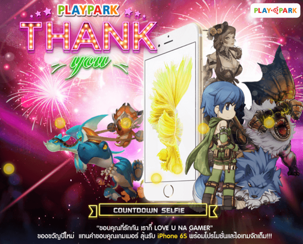 PLAYPARK.COM ผู้ให้บริการเกมออนไลน์ชั้นนำ ในเครือเอเชียซอฟท์ฯ ขอมอบของขวัญสุดพิเศษแทนคำขอบคุณเกมเมอร์ทั่วประเทศ ให้สุขสุดๆ ส่งท้ายปี ด้วยแคมเปญ “PLAYPARK Thank You” ที่รับรองว่าจี๊ดโดนใจ โดยมีทั้งหมด 4 กิจกรรมให้ร่วมสนุกกัน แต่รอบนี้จะมาเจาะลึกกิจกรรม “Countdown Selfie” ที่มีรางวัลใหญ่เป็น iPhone 6s และแรร์ไอเทมจาก 12 เกมดัง