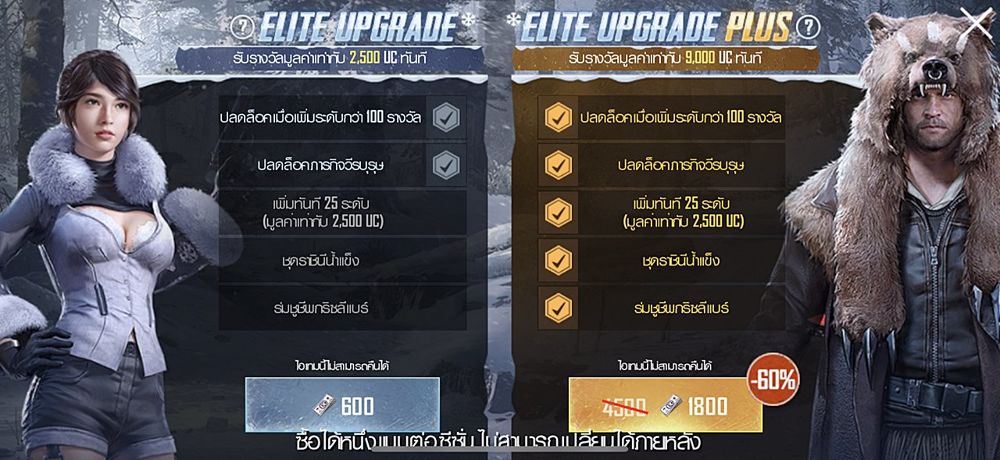 - การอัพเกรดเป็น Elite Royale Pass ในซีซั่นนี้ คุณจะได้รับ UC รวมตลอดการเพิ่มเลเวล โดยจะได้รับ UC รวมทั้งหมดเท่ากับ 600 UC ซึ่งนั่นเท่ากับจำนวน UC ที่ใช้เพื่อการปลดล็อค Elite Royale Pass ก็เหมือนได้รับ Pass และไอเทมทั้งหมดอื่นๆไปเลยฟรี!
