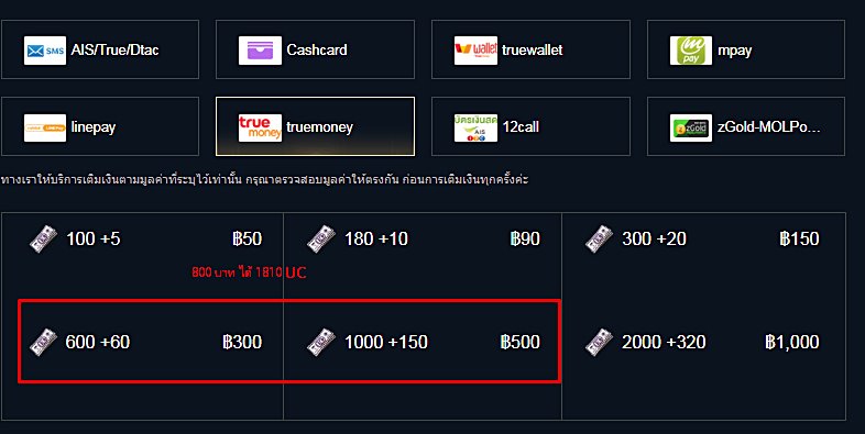 - เติมผ่านเว็บไซต์ เติม 800 บาท ได้รับ 1810 UC