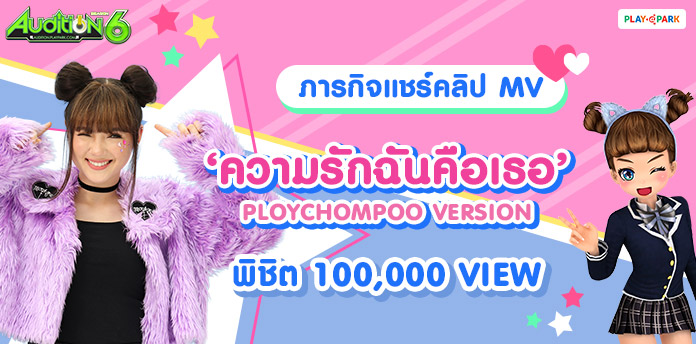 Audition ชวนชาวออดิชั่น กดสดงดโปรโชว์ความรัก(ฉันคือเธอ) กับเพลง ความรักฉันคือเธอ Ver. ใหม่จาก พลอยชมพู เพื่อรับไอเทม White Jersey Couple Style ระยะเวลา90 วัน x จำนวนคลิปที่ถูกกติกา สนุกด้วยกันตั้งแต่วันนี้ – 28 กุมภาพันธ์ 2562และ ชวนเพื่อนๆมา ฟังเพลง ความรักฉันคือเธอ New Version จาก Ploychompoo พร้อมแชร์บนFacebook ของตัวเองแบบสาธารณะ เพื่อรับไอเทมหน้า Lovely Cap ระยะเวลา 90วัน (ถ้าแชร์ครบ 2,019 แชร์เพิ่มระยะเวลาไอเทมเป็น 1ปี)ตั้งแต่วันที่ 14 กุมภาพันธ์ – 14มีนาคม 2562  สามารถติดตามรายละเอียดกิจกรรมเพิ่มเติมได้ที่ audition.playpark.com