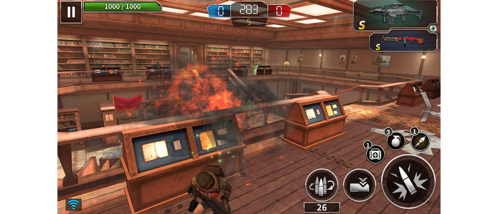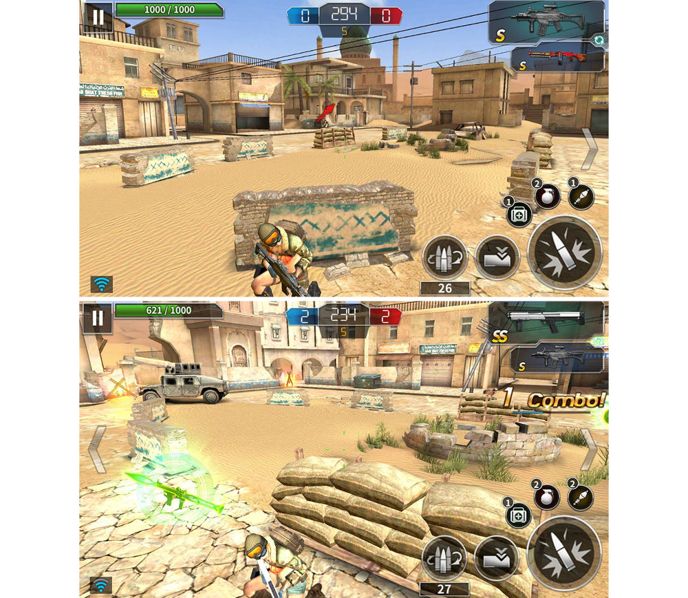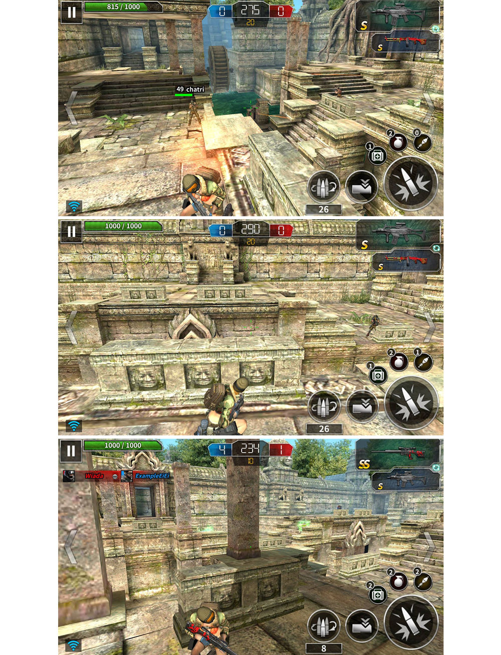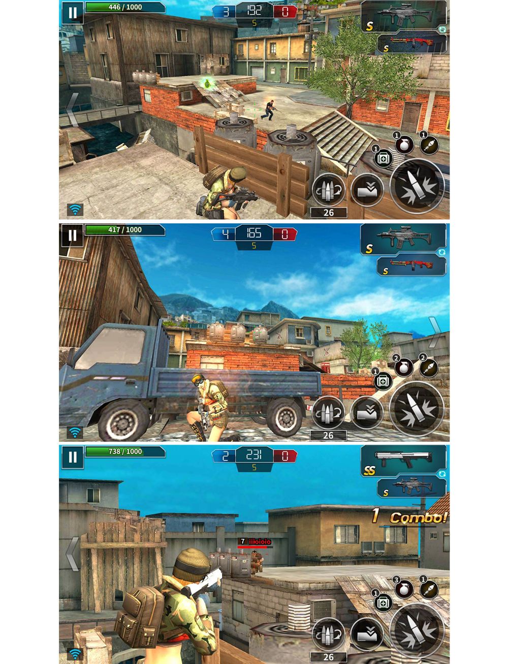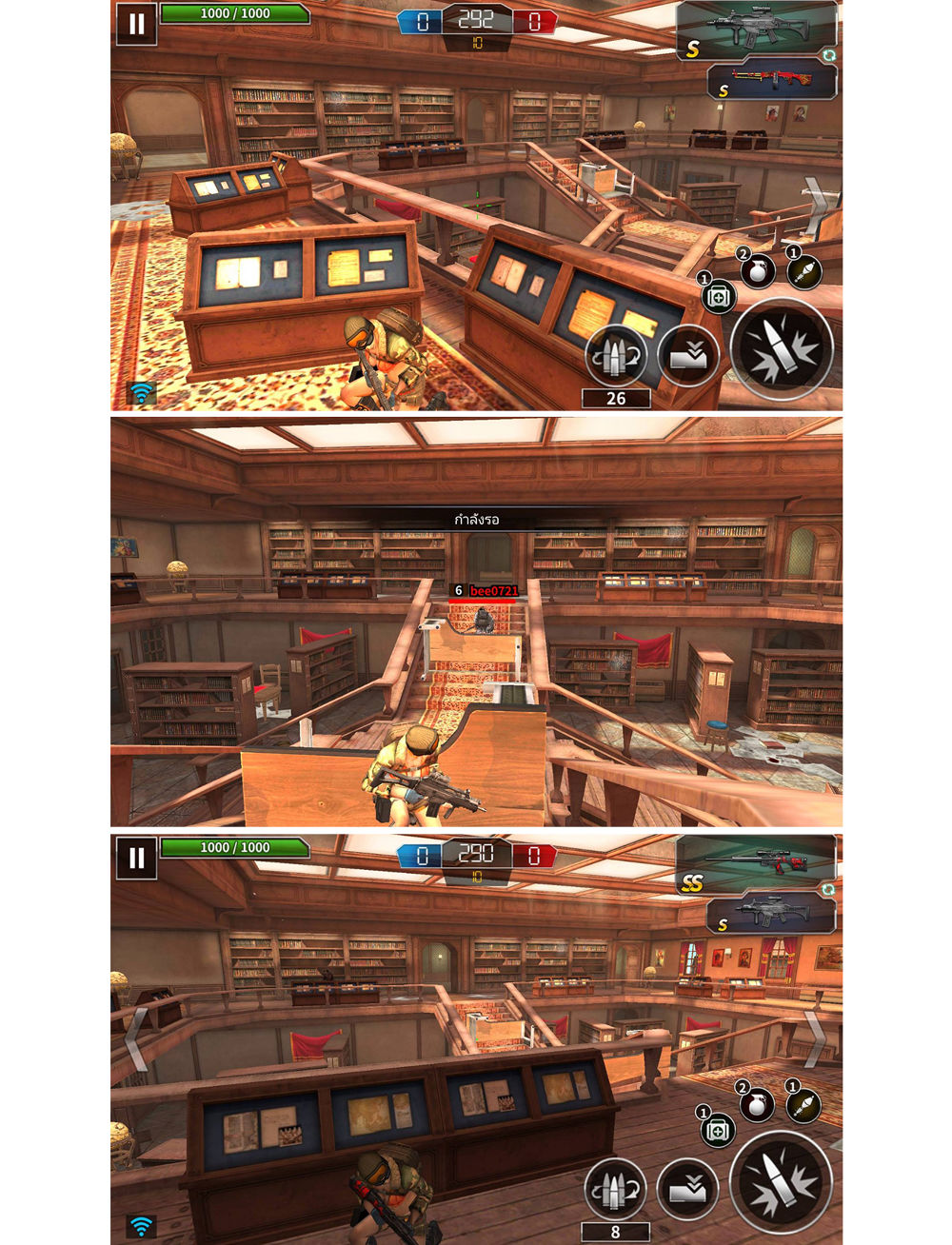 ด่านในเกมตอนนี้จะมีทั้งหมด 5 ด่าน คือ ซึ่งแต่ละโหมดก็จะมีด่านให้เล่นไม่เหมือนกัน บางโหมดมีด่านเหมือนกันแต่กำบังเปลี่ยนก็มี เรามาดูภาพรวมของแต่ละด่านกันเลยยด่านนี้จะเป็นการเผชิญหน้ากันตรงๆ ไม่มีอะไรซับซ้อน ทริคก็มีแค่พยายามพังกำบังของฝั่งตรงข้ามให้อีกฝ่ายไม่มีที่หลบ แล้วใช้ไอเทมกับบัฟให้เป็นประโยชน์ก็จะช่วยได้ จุดที่ต้องระวังคือการอยู่มุมเฉียงกับศัตรู เพราะศัตรูจะเห็นตัวเราได้ง่าย (แต่เราก็เห็นมันเช่นกัน) ระยะระหว่างผู้เล่นในด่านนี้จะค่อนข้างไกลทำให้ยิงได้ยากหน่อย เหมาะกับการใช้ปืนไรเฟิลห้องสมุดเหมือนเดิม เพิ่มเติมคือกำบังเปลี่ยน! พอมาเล่นแบบ 2 VS 2 แล้ว ด่านนี้จะมีกำบังเพิ่มขึ้นมาทางด้านซ้าย-ขวา และตรงกลาง และกำบังเดิมจากที่อยู่ห่างกันก็โดนขยับให้อยู่ติดกันแทน ซึ่งตรงจุดใหม่ที่เพิ่มขึ้นมา เป็นจุดที่ทำให้ยิงศัตรูได้ในระยะใกล้สุดๆ ถ้าศัตรูอยู่ในจุดเดียวกัน ดังนั้นตรงนี้ใครที่มีปืนลูกซองจะได้เปรียบมากเพราะสามารถยิงอัดหน้าศัตรูได้เต็มๆเราสามารถเล่นด่านนี้ได้ในโหมด 1 VS 1 และ 2 VS 2 ด่านนี้จะคล้ายกับด่านห้องสมุด คือเป็นที่เปิดให้ยิงสู้กัน ไม่มีอะไรซับซ้อน แต่จะมีมุมให้ยิงเยอะกว่าเนื่องจากกำบังจะวางแบบครึ่งวงกลม ไม่ได้อยู่ตรงๆ อย่างเดียว ดังนั้นต้องคอยมองมุมให้ดีเพราะจะโดนยิงฟรีได้ง่ายๆ ระยะระหว่างผู้เล่นในด่านนี้ปานกลางถึงใกล้ ดังนั้นจะใช้ปืนอะไรเล่นก็ได้สลัม