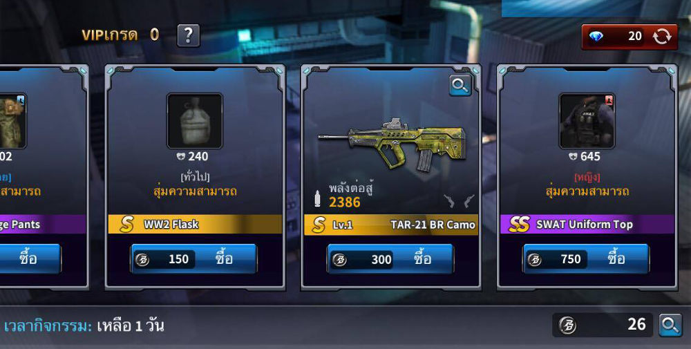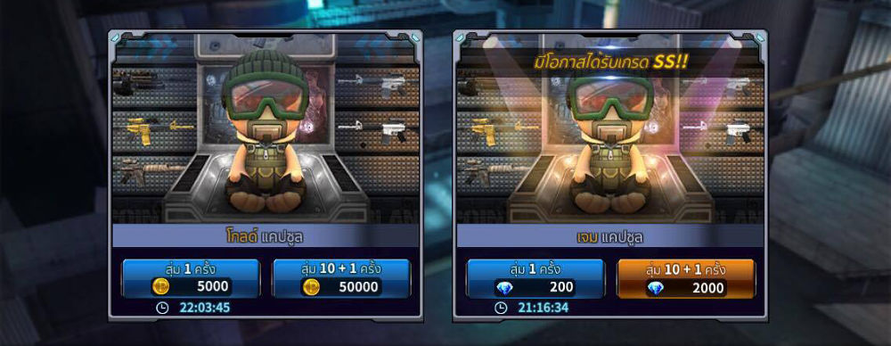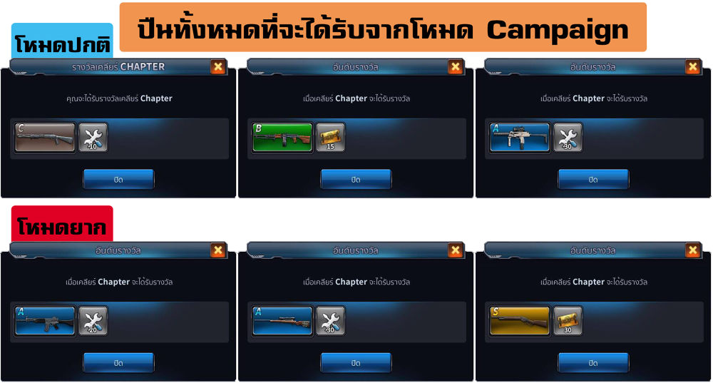 วิธีที่ 1 เล่นโหมด Campaignโหมดนี้เค้าแจกรางวัลเยอะจริง ทั้งชิ้นส่วนอัพเกรด, ชุด, โกลด์, เพชร และที่เราจะพูดถึงในวันนี้ก็คือ ปืนนั่นเองปืนที่เราจะได้รับจากโหมด Campaign จะมี 6 กระบอกด้วยกัน แยกเป็นระดับปกติ 3 ปืน และระดับยาก 3 ปืน ดังนี้1. ปืนลูกซอง 870MCS เกรด C เมื่อเคลียร์ Chapter2. โกสท์ทาวน์2. ปืนกลหนัก RPD เกรด B เมื่อเคลียร์ Chapter4. แกรนด์ บาซาร์3. ปืนกลเบา MP9 Ext เกรด A เมื่อเคลียร์ Chapter6. ท่าเรืออคาบ้า1. ปืนไรเฟิลจู่โจม K-2 เกรด A เมื่อเคลียร์ Chapter2. โกสท์ทาวน์2. ปืนสไนเปอร์ Winchester M70 เกรด A เมื่อเคลียร์ Chapter4. แกรนด์ บาซาร์3. ปืนลูกซอง M1887 เกรด S เมื่อเคลียร์ Chapter6. ท่าเรืออคาบ้าจะเห็นได้ว่าระดับยาก จะได้ปืนที่ดีกว่าเยอะเลย แต่การจะผ่านได้ก็ไม่ง่ายเช่นกัน ก็... สู้ๆ นะคะ 555วิธีที่ 2 เล่นโหมด Survivalโหมดนี้มันคือโหมดหาปืนโดยแท้เลยเเหละ เราจะได้ปืนแบบสุ่มหลังจากที่เราผ่านทุกๆ 3 Chapter ก็คือ เราจะได้ปืนตอนจบ Chapter 3 และ 6 เป็นต้น ยิ่งเราเล่นไปได้ไกลเท่าไหร่ ก็จะมีโอกาสสุ่มได้ปืนเกรดสูงขึ้นด้วย ซึ่งมันจะมีบอกหลังจากจบทุกๆ 3 Chapter ไปแล้ว ว่าถ้าเล่นต่อจะมีโอกาสสุ่มได้อะไรบ้าง **ข้อควรระวัง ถ้าเราตายหรือออก เราจะไม่ได้อะไรเลย ดังนั้นควรพกยาไปเยอะๆ กันตาย หรือถ้าเล่นแล้วรู้สึกว่าเริ่มสู้ไม่ได้ ให้กด "หยุด" เพื่อรับของไปเลยเมื่อมันขึ้นมาให้กดในโหมด PVP เรามีโอกาสได้ไอเทมต่างๆ หลังจากจบแมทช์ หนึ่งในนั้นก็คือปืน แต่ก็ไม่ใช่ทุกครั้งที่ได้ไอเทมนะ อยู่ที่ดวงล้วนๆ เลย จะฆ่าเยอะฆ่าน้อยก็ไม่เกี่ยวกัน ดังนั้นไม่ต้องห่วงถ้าเกิดเล่นไม่เก่ง แค่ไปเล่นก็พอแล้ว มีสิทธิได้ลุ้นทุกคน วิธีที่ 4 เข้าไปที่ตลาดมืดตลาดมืดนี้ เราจะเข้าได้เพียงอาทิตย์ละวัน ก็คือวันศุกร์ เวลา 6 โมงเย็นเป็นต้นไป ซึ่งในโหมดนี้จะมีปืนระดับโหดๆ วางขายอยู่เพียบเลย และไอเทมที่วางขายจะเปลี่ยนทุกๆ สัปดาห์ ถ้าใจร้อนไม่อยากรอก็กดใช้ 20 เพชร ที่มุมขวาบน เพื่อ Reset ของที่วางขายได้ แต่เราจะซื้อของในตลาดมืดได้ด้วย เหรียญ PB เท่านั้นวิธีที่ 5 ใช้พลังเงิน!! สุ่มแคปซูลอันนี้สำหรับผู้ที่ใจร้อนและมีพลังเงิน เติมเพชร แล้วสุ่มแคปซูลเอาเลยค่า แคปซูลนี้จะอยู่ในร้านค้าหน้าแรก สุ่มได้ในราคาครั้งละ 200 เพชร หรือ 10+1 ครั้งในราคา 2,000 เพชร (คุ้มกว่า เพราะแถมให้ 1ครั้ง) นอกจากนี้ยังสามารถสุ่มได้ฟรีด้วย 1 ครั้งในทุกๆ 24ชั่วโมง (แต่มีสิทธิ์ได้ชิ้นส่วนอัพเกรดแทนปืนด้วยเหมือนกันนะ โปรดทำใจก่อนสุ่ม 5555) หรือจะสุ่มแบบธรรมดาก็ได้ ในราคาครั้งละ 5,000 โกลด์ หรือสุ่มฟรี 5 ครั้งต่อวัน (ดีเลย์ 10 นาที) แต่ของที่ได้จะไม่ดีเท่าวิธีที่ 6 ลงแข่ง Tournament ต่างๆเกม Point Blank Mobile จะมีการจัดการแข่