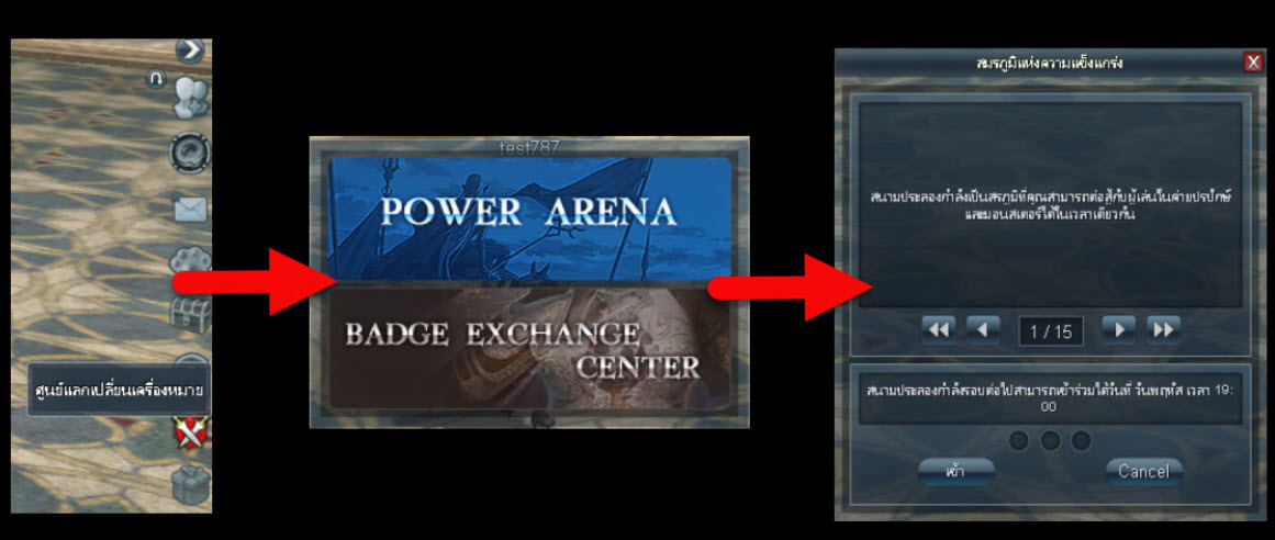 ผู้เล่นจะสามารถรับรู้ได้ว่า Power Arena จะเปิดขึ้น โดยที่ทางทีมงานจะประกาศแจ้งเตือนในเกม โดยวิธีการเข้าก็ง่ายๆ ตามตัวอย่างด้านล่างนี้เลย