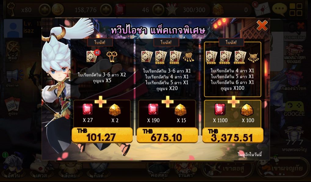 แพ๊กเกจ ทวีปไอช่า มีทั้งหมด 3 รูปแบบแพ๊กเกจให้เลือกครั้บมีดังนี้1.ใบเรียก อัศวิน 3 – 6 ดาว 2ใบ กุญแจ 5 ดอก รูบี้ 27 ชิ้น โทปาส 2 ชิ้น ในราคา 101.27 บาท2.ใบเรียก อัศวิน 3 – 6 ดาว 1ใบ ใบเรียกอัศวิน 4 ดาว 1ใบ ใบเรียกอัศวิน 5 ดาว 1ใบ กุญแจ 20 ดอก รูบี้ 190 ชิ้น โทปาส 15 ชิ้น ในราคา 675.10 บาท 3.ใบเรียก อัศวิน 4 ดาว 1ใบ ใบเรียกอัศวิน 5 ดาว 1ใบ ใบเรียกอัศวิน 6 ดาว 1ใบ กุญแจ 100 ดอก รูบี้ 1100 ชิ้น โทปาส 100 ชิ้น ในราคา 3,375.51 บาท ช่องทางการเติมเงินสำหรับ iOS
