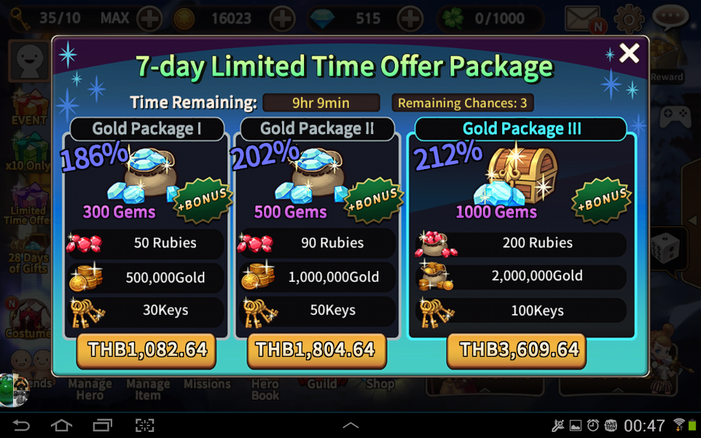 - การ์ด เลือกธาตุ 3ดาว 2 ใบ- รูบี้ 27 ชิ้น โทปาส 2 ชิ้น2.ชุดที่สอง ราคา 674.89 บาท- การ์ด เลือกธาตุ 3ดาว 1 ใบ- การ์ด เลือกธาตุ 4 ดาว 1 ใบ- ชุดเกราะ 6 ดาว(ป้องกัน +125 พลังชีวิต +660)- รูบี้ 190 ชิ้น โทปาส 15 ชิ้น3.ชุดที่สาม ราคา 3,371.37 บาท- อาวุธกายภาพ 6 ดาว(พลังโจมตี +220 ความเร็ว +25เปอเซ็น)- อาวุธเวทย์ 6 ดาว(พลังเวทย์ +220 ความเร็ว +25เปอเซ็น)- การ์ด เลือกธาตุ 4 ดาว 2 ใบ- การ์ด เลือกธาตุ 5 ดาว 1 ใบ- รูบี้ 1,100 ชิ้น โทปาส 100 ชิ้นช่องทางการเติมเงินของ iOS