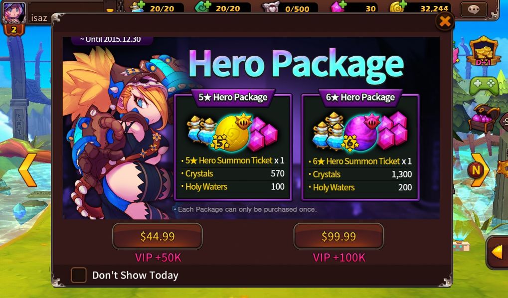 1.5ดาว Package ได้รับ 5 ดาว Hero Summon Ticket x1 Cystals 570 Holy Waters 100