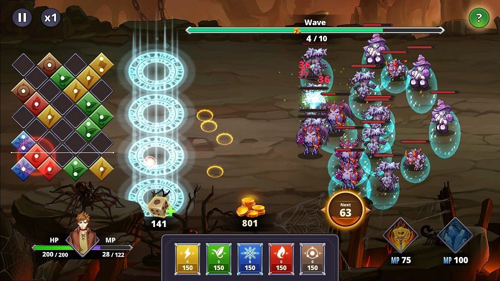 เพียงแค่กดปุ่ม "ลูกเต๋า" เพื่อวาง "สีธาตุของลูกเต๋า" ในช่องตารางสี่เหลี่ยมตามจุดต่างๆ เอาไว้จู่โจมศัตรูที่โผล่มาเป็น Wave ก่อนที่พวกมันจะลดค่าพลังชีวิต (HP) ของเราจนหมดเกลี้ยง