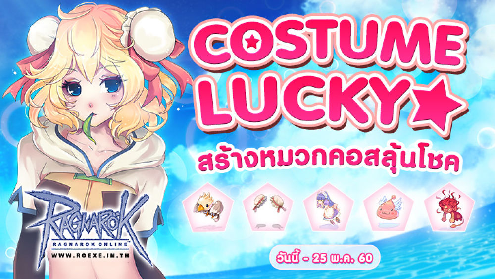 อัพเดตไอเทม Costume ใหม่ มาพร้อมกิจกรรม Costume Lucky เพียงทำหมวก Costume ตามที่กำหนดได้สำเร็จในช่วงกิจกรรม รับไปเลย Biscuit Stick ยกเซต แถมยังมีสิทธิ์ลุ้นรางวัล Lucky Draw : Costume Bao Bao อีก 5 รางวัลฟรีอีกด้วย! แล้วมาสร้างไอเทม Costume ที่โดนใจคุณได้ ตั้งแต่วันนี้ - 25 พฤษภาคม 2560