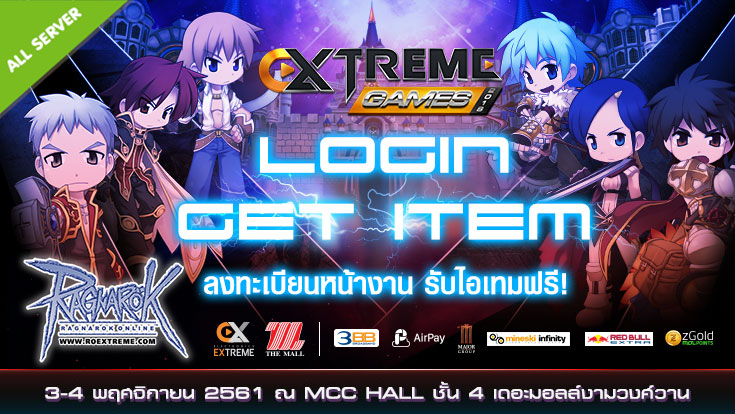 พร้อมหรือยังสำหรับงานเกมสุดยิ่งใหญ่แห่งปี Extreme Games 2018 :: Games On งานที่เกมเมอร์ตัวจริงพันธ์เอ็กซ์ตรีมต้องไม่พลาด พบกับกิจกรรมสุดพิเศษที่เรียกได้ว่ามาต้อนรับกันตั้งแต่หน้าประตู กับกิจกรรม Login Get Item! เกม Ragnarok เพียงลงทะเบียนหน้างาน รับไอเทมไปเลยฟรีๆ โดยภายในงานแต่ละวัน ไอเทมจะแบ่งเป็นทั้งหมด 2 รอบ (รอบเช้า และ รอบเย็น) แถมยังมีโอกาสลุ้นรับแรร์ไอเทมพิเศษในแต่ละรอบ!นอกจากนี้หากทำการ Login ครบทั้ง 2 รอบ ภายในงานแต่ละวัน ก็จะได้รับโบนัสไอเทมเพิ่มไปอีก จัดเต็มความสนุกพร้อมไอเทมเด็ดๆ ตลอดทั้ง 2 วัน พบกัน 3 - 4 พฤศจิกายนนี้ ณ MCC Hall ชั้น 4 เดอะมอลล์ งามวงศ์วาน