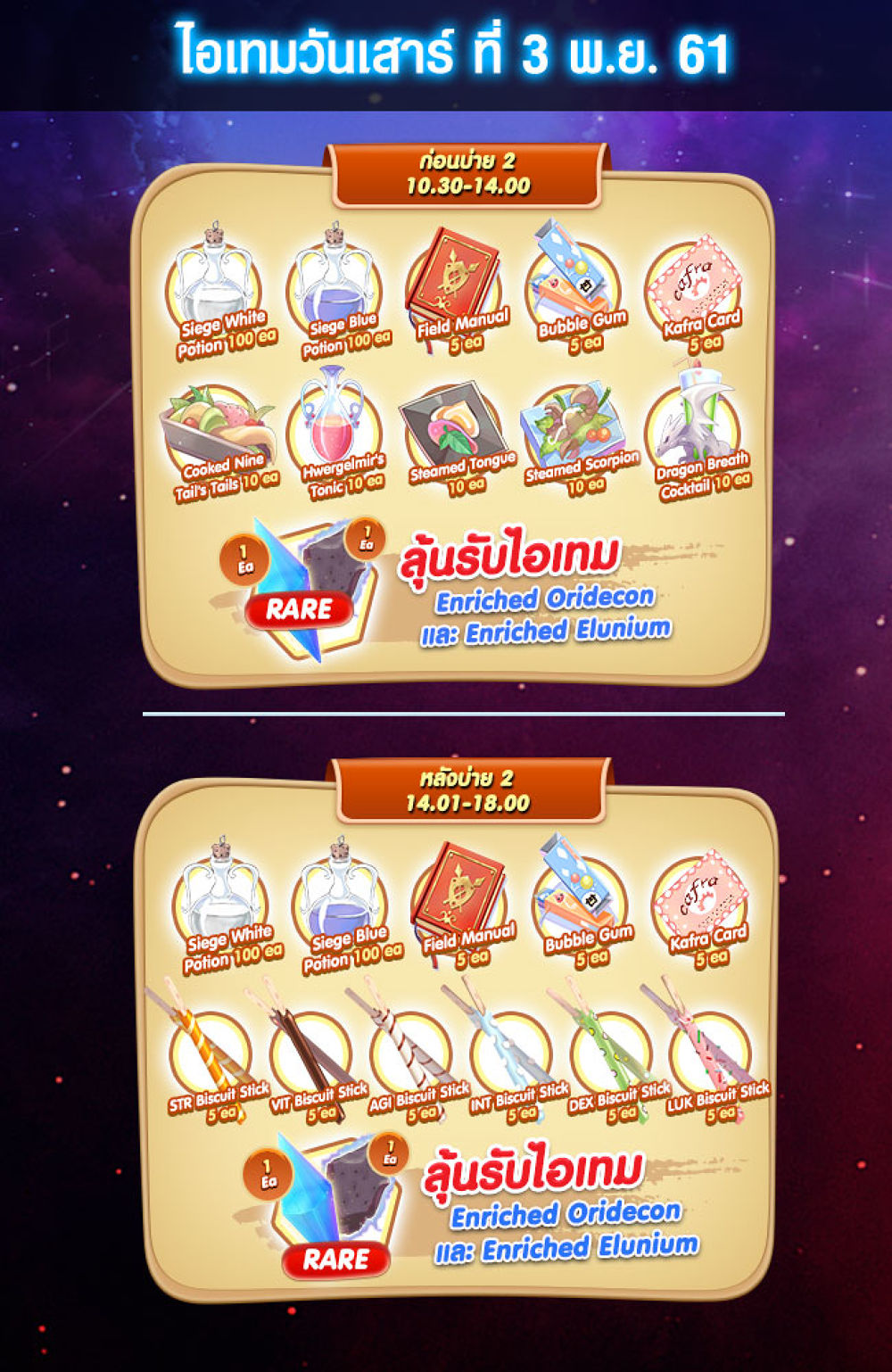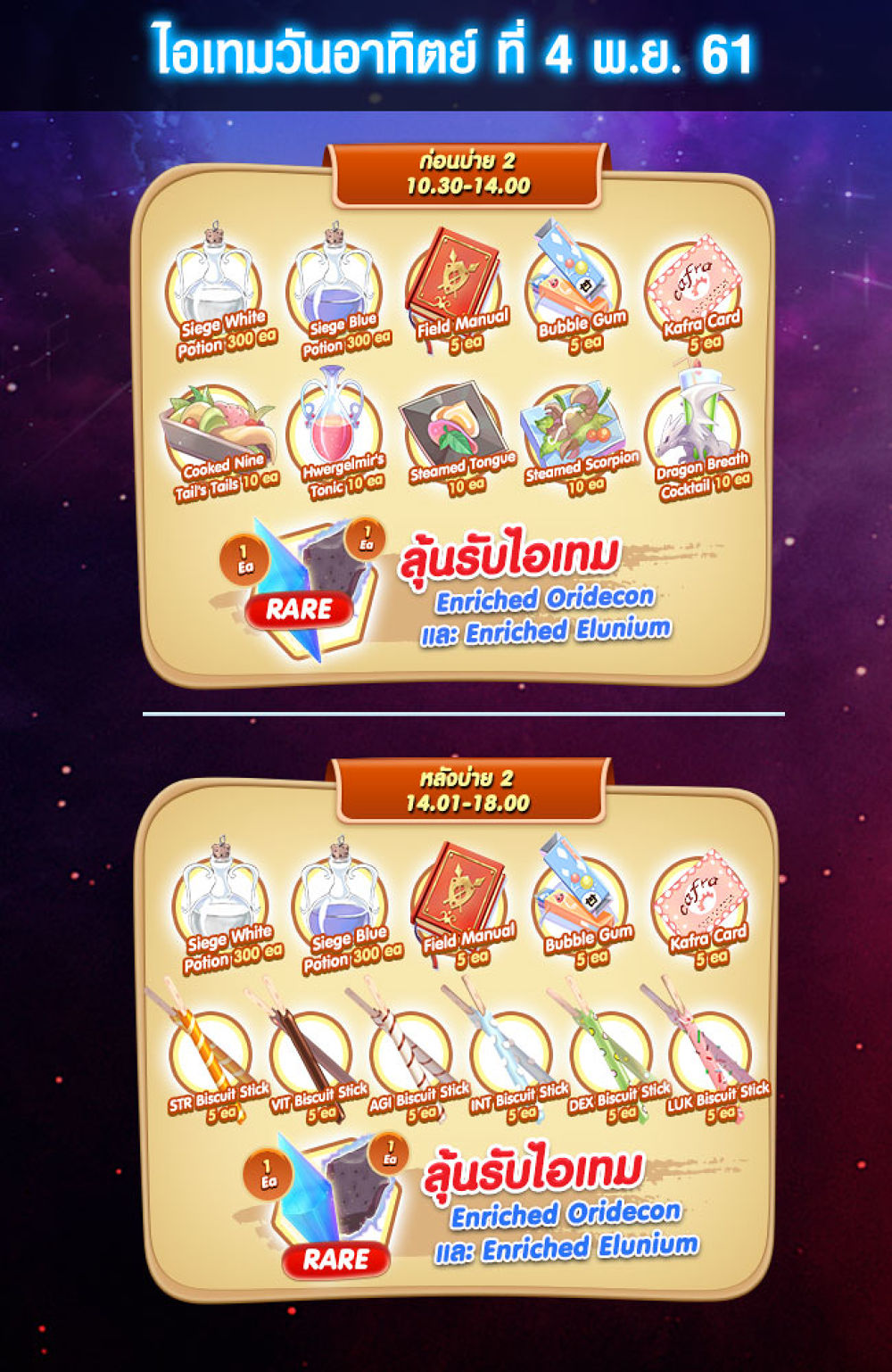 ไอเทมที่ได้รับ เมื่อทำการ Login ภายในงาน วันที่ 3 พฤศจิกายน 2561 ไอเทมที่ได้รับ เมื่อทำการ Login ภายในงาน วันที่ 4 พฤศจิกายน 2561 พิเศษยิ่งขึ้น!! หาก Login รับไอเทมครบทั้ง 2 รอบ ภายในงานแต่ละวัน