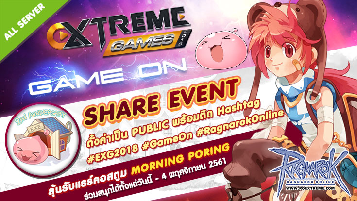- ให้ผู้เล่นทำการกดแชร์โพสต์ Event งาน Extreme Games 2018 : Game On ตั้งค่าเป็น Public พร้อมติด Hashtag #EXG2018 #GameOn #RagnarokOnline