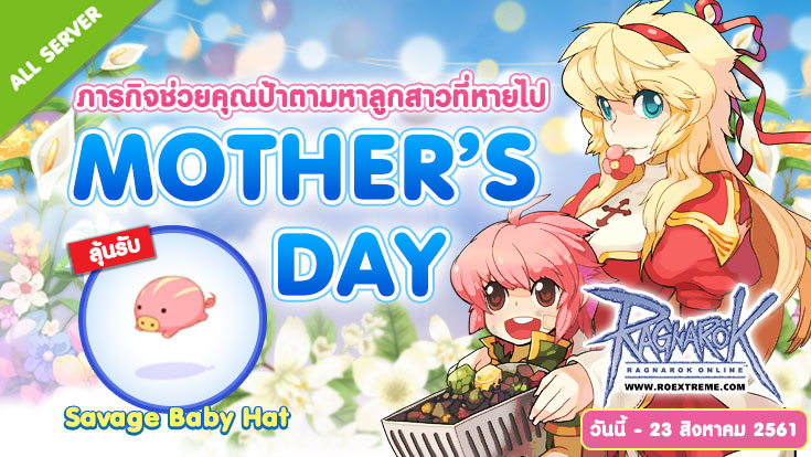 ร่วมเฉลิมฉลองเทศกาลแห่งความรักของแม่ ปี 2561 กับ Ragnarok Extreme ขอมอบภารกิจแสนอบอุ่น กับการช่วยคุณป้าตามหาลูกสาวที่หายไป หากทำภารกิจสำเร็จรับไปเลยค่าประสบการ์ณ พร้อมลุ้นรับหมวกลูกหมูสุดน่ารัก Savage Baby Hat และของรางวัลอีกมากมาย ตั้งแต่วันนี้ - 23 สิงหาคม 2561
