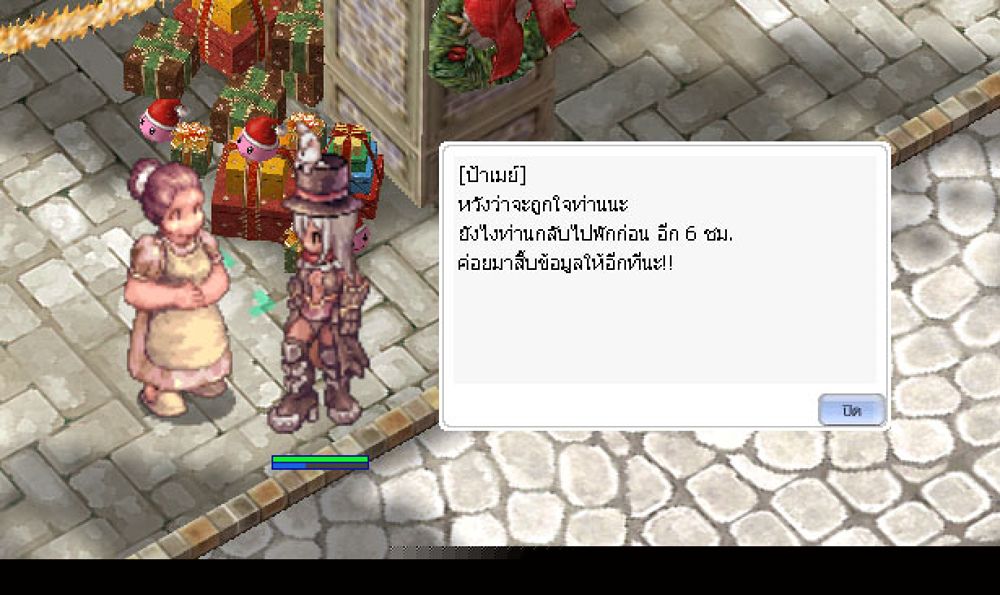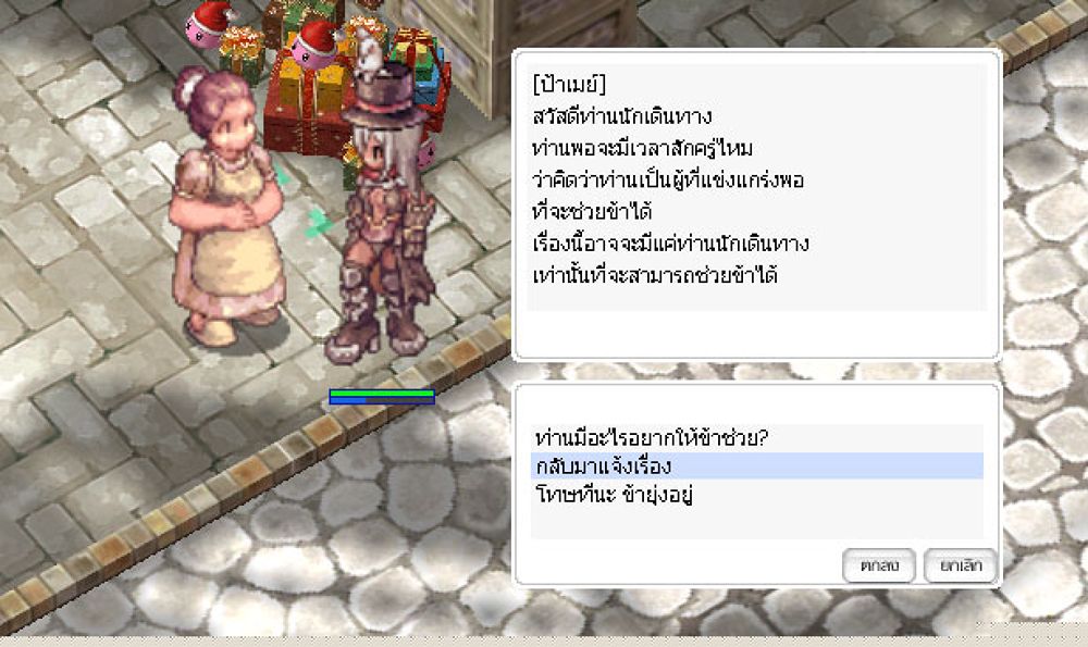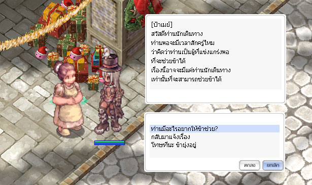 จากนั้นให้กลับมาทำการคุยกับ NPC ป้าเมย์ ที่เมือง Prontera พิกัด 146,152 เลือกกลับมาแจ้งเรื่อง ซึ่งเราจะต้องจ่ายเงินจำนวน 10,000 Zeny จะได้รับ EXP 30,000 / JOB EXP 15,000 พร้อมสุ่มรับไอเทม 1 ชิ้น เป็นของรางวัล