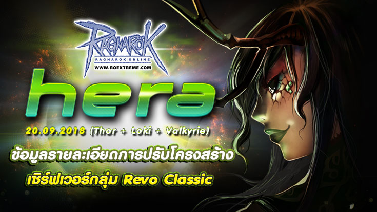 หลังจากที่ Ragnarok Online Thailand มีการประกาศเตรียมปรับโครงสร้างเซิร์ฟเวอร์สำหรับแพทช์ Revo Classic ซึ่งข้อมูลต่อไปนี้จะเป็นข้อมูลสำหรับรายละเอียดต่างๆที่จะเกิดขึ้นหลังจากมีการปรับโครงสร้างในวันที่ 20 กันยายน 2561 โดย เซิร์ฟเวอร์ในกลุ่ม Revo Classic ในปัจจุบันทั้ง 3 เซิร์ฟเวอร์ ได้แก่ Thor, Loki, Valkyrie จะถูกปรับให้เหลือ 1 เซิร์ฟเวอร์ คือ Heraโดยทางทีมงานจะทำการปิดปรับปรุงเซิร์ฟเวอร์เพื่อปรับโครงสร้าง ตั้งแต่ วันที่ 19 ก.ย. 61 เวลา 00.30 น. จนถึง วันที่ 20 ก.ย. 61 เวลา 7.00 น. (EXP Bonus Time x150% เริ่ม 20 - 24 ก.ย. เวลา 12.00 น. หลังปรับโครงสร้าง)