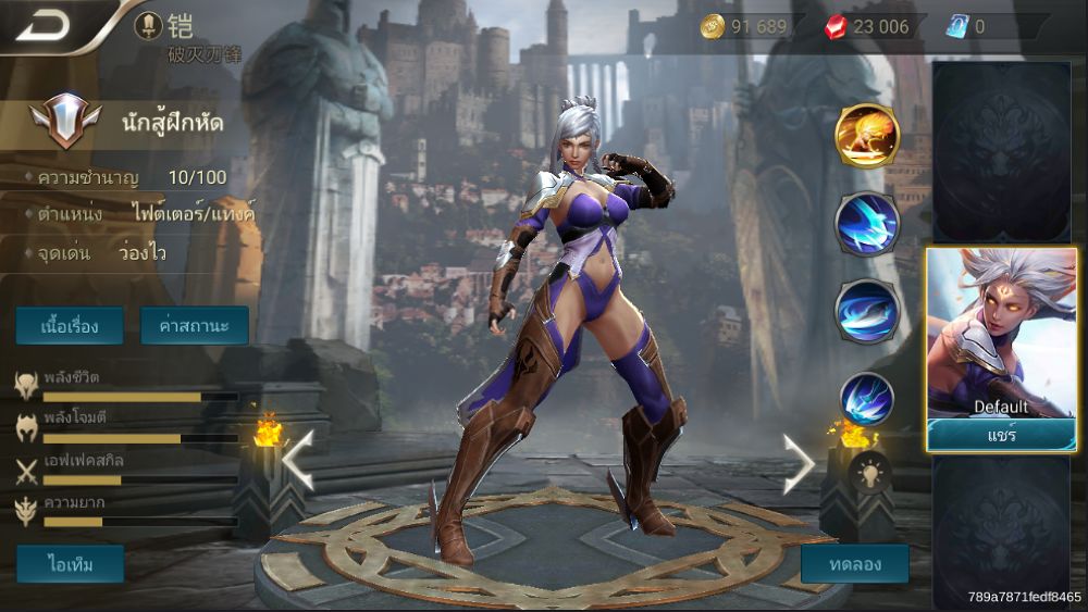 - สร้างความเสียหายกายภาพ 150 / 180 / 210 / 240 / 270 / 300 (+ 60% โบนัสพลังโจมตี) ศัตรูที่โดนสกิลนี้จะถูกลดความเร็วเคลื่อนที่ 30%