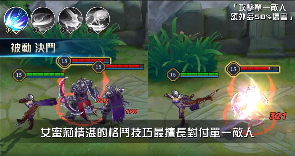 - สกิลติดตัว : หาก Amily โจมตีศัตรูในรูปแบบ 1 ต่อ 1 จะสร้างความเสียหายเพิ่มเติม 50%