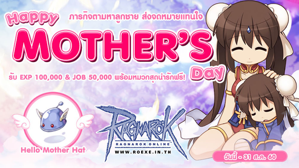 ต่อมาเป็นภารกิจ HappyMother's Day 2017 ตามหาลูกชาย ส่งจดหมายแทนใจ โดยทาง RagnarokOnline Thailand ขอมอบภารกิจสุดอบอุ่น กับการช่วยคุณยายตามหาลูกชายที่หายไปพร้อมส่งจดหมายแทนใจฝากความคิดถึง หากทำภารกิจสำเร็จรับไปเลย EXP 100,000 & Job 50,000 พร้อมหมวกสุดน่ารัก Hello Mother Hat และไอเทมอื่นๆอีกมากมายตั้งแต่วันนี้ - 31 สิงหาคม 2560 อ่านรายละเอียดเพิ่มเติมของกิจกรรม HappyMother's Day 2017 ได้ที่ : https://ro.exe.in.th/news/happy-mothers-day-2017
